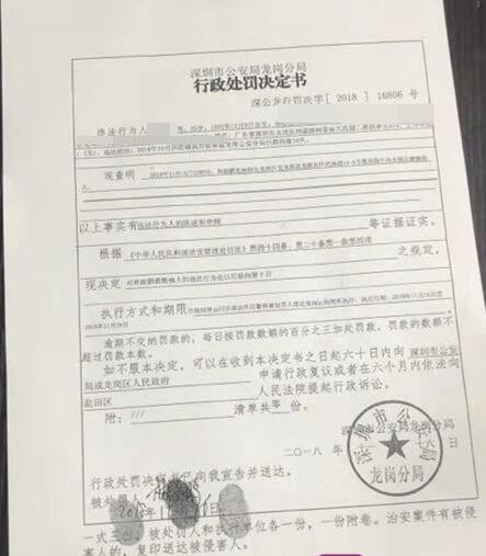 在行政处罚决定书中还可以看到,违法行为人林某10月份还曾因为阻碍警方执行职务,被深圳市公安局龙岗分局处以行政拘留十天。