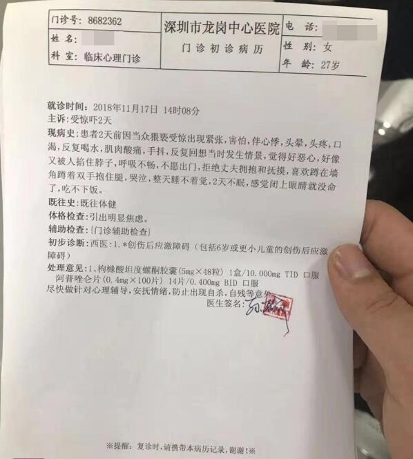 医院的初步诊断是创伤后应激障碍,建议尽快做心理辅导,安抚情绪,防止出现自杀、自残等意外。