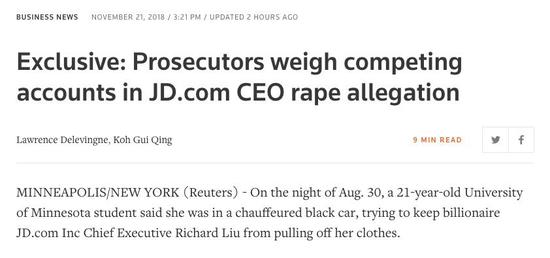 9月24日,路透社公布了刘强东性侵案的更多细节。文章提到,21岁的明尼苏达大学女生半夜向好友发微信称,刘强东已强迫她与其发生性关系。