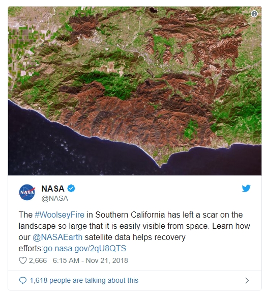 NASA在推特发布卫星图,表示,南加州大火烧秃的地方在太空中清晰可见。