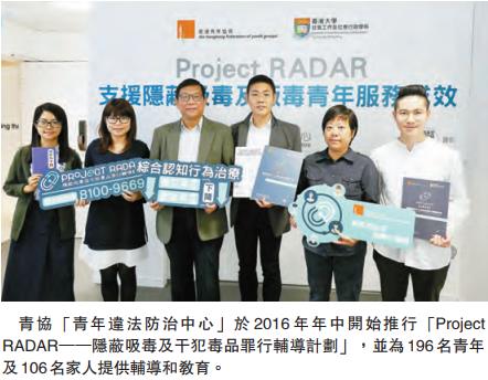 青協「青年違法防治中心」於2016年年中開始實行「Project RADAR——隱蔽吸毒及干犯毒品罪行輔導計劃」,成功建立跨專業轉介機制,與本港8間醫院、新界北警區、社會福利署、海關、律師及學校等攜手合作,並為196名青年及106名家人提供輔導和教育。中心又與香港大學社會工作與社會行政學系教授黃富強的團隊合作,追蹤服務對象的行為,研發出「青少年毒品罪行風險綜合評估」,同時推出「綜合認知行為治療手冊」,集結理論與前線社工的實務經驗,為業界提供一個有系統與專業的輔導工具。