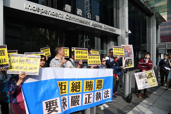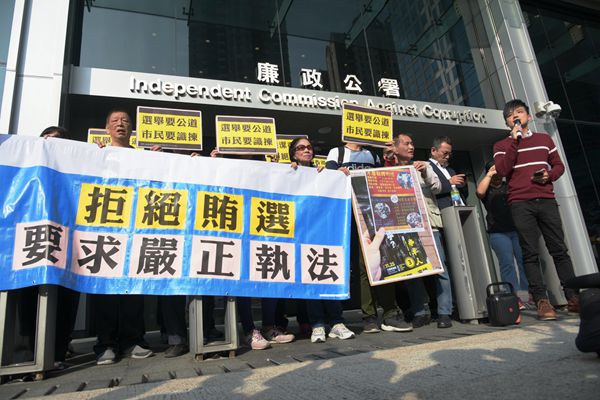 昨午3時,社區幹事何坤洲聯同約20名市民到北角廉政公署總部外集合,他們手持「拒絕賄選,要求嚴正執法」的橫額,高喊「選舉要公平」、「廉潔香港」等口號。市民尹先生向傳媒表示,早前經過九龍西,有義工向他派發選舉宣傳單張,又指其派發湯和湯壺,但當他去到有關辦事處後才發現是12月1日派發湯水。