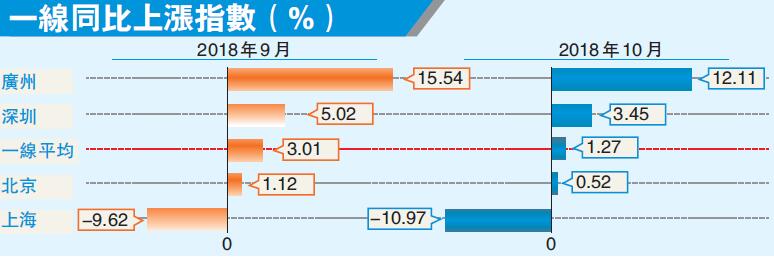 報告指出,10月一線城市房價集體微降,北京、深圳房價回升進程中斷,廣州樓市由熱轉冷。與2018年9月相比,10月一線城市房價環比平均下跌1.857%,跌幅比上月進一步擴大1.3個百分點。廣州、北京、深圳、上海四個一線城市房價均環比下跌。其中10月深圳環比下跌0.83%,北京環比下跌1.99%,廣州環比下跌1.9%,上海環比下跌2.71%。與上年同期相比,2018年10月一線城市平均同比漲幅降至1.277%,其中北京同比上漲0.52%,深圳同比上漲3.45%,廣州同比上漲12.11%,上海同比下跌10.97%。