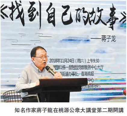 【香港商报网讯】继ProTalk院士沙龙活动之后,11月24日(周六)上午9:30,深圳南山智园B1栋智园党群服务中心大厅,桃源公众大讲堂第二期迎来了8位重磅级文学大咖。分别是蒋子龙、何立伟、陈世旭、刘玉民、董立勃、荊歌、荣荣、朱小平。现场座无虚席,蒋子龙做了主题为《找到自己的故事》的讲座,之后与其他7位嘉宾一起在台上分享观点,与观众互动交流。蒋子龙签书环节排起了长龙。此外作家们还参观了新视艺创客公园以及南方科技大学琳恩图书馆,最后作家们还为桃源留下了珍贵的墨宝。