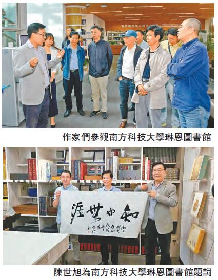 而最让作家们感兴趣的是“天雨流芳”特藏室,这里收藏着不少限量版的图书珍品,其中有全球限量发行百套的油画。在翻看《聊斋画选》的册页时,荆歌说真漂亮,宋代高仿书也是少见。在特藏室里,荆歌还为其所著的《生活道理》一书签名,同时刘玉民也为其所著的《骚动之秋》签名。陈世旭挥毫写下“知也无涯”赠给图书馆,以勉励学生勤奋学习。从图书馆望出去,对面正在兴建新馆。据悉,目前南科大正在进行二期建设,待建设完成,校园将增加两处图书馆馆舍,两个新馆将分别于2019年9月和2020年3月开放使用,届时,校园将形成“科学馆”、“人文馆”和“学习苑”三足鼎立的图书馆服务格局。