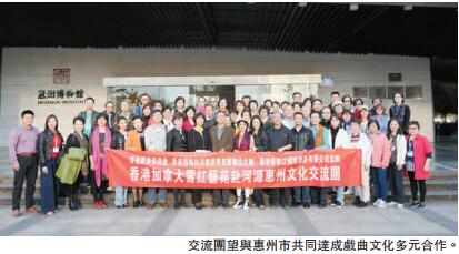 【香港商報网訊】記者呂明霞報道:由香港戲曲促進會、香港(加拿大)雪紅藝苑、香港國際柏沛樂蘋果果膠聯合主辦的「河源、惠州文化藝術交流團」順利舉辦。逾40位粵劇界著名人士及愛好者共赴自然、文化、藝術之旅,受到河源市、惠州市領導的熱烈歡迎、熱情款待。林克輝任榮譽顧問,白雪紅任榮譽團長,符茱莉任團長。