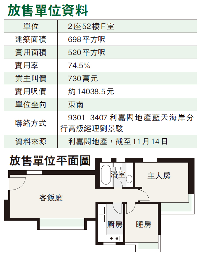 是次介紹單位為東涌海堤灣畔2座52樓F室,坐向東南,屬2房戶型,建築面積698平方呎,實用面積520平方呎,業主叫價730萬元。單位長形客飯廳面對大窗戶,可享開揚山景及小部分海景,遠眺東堤灣畔及360纜車,同時設有對流窗,整個空間採光及通風兼得。主人房大小約60多平方呎,在衣櫃及大床之外,仍見闊落空間;睡房約40多平方呎,現為書房,將來或可改回睡房。