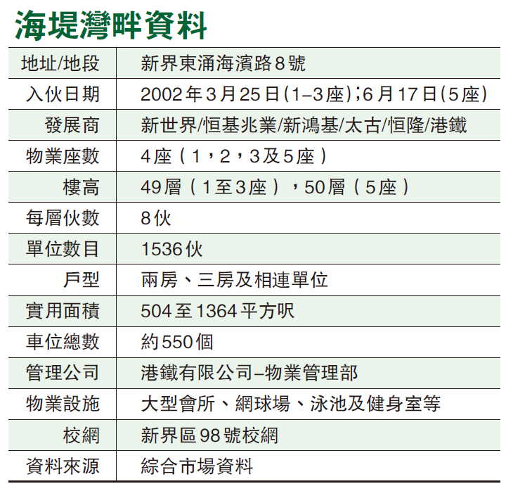【香港商報网訊】記者馮金鋒報道:東涌海堤灣畔雖位處大嶼山,但出入香港市區僅需半小時,相較新界其他樓盤,730萬元的極高層開揚單位清靜物美,值得納入考慮。此屋苑過去樓價每年約有一成上升,不論自住還是保值投資,都不失為一個上乘選擇。