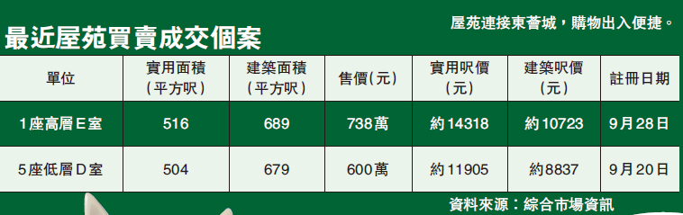 現時該屋苑2房及3房共約有20個放盤。除上述8月成交單位,11月有2座6樓G室的3房低層單位,以822萬元成交。