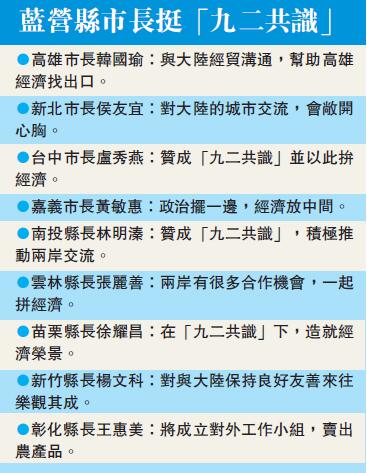 另外,新竹縣、苗栗縣、彰化縣等國民黨掌握的新任縣市首長,都認同「九二共識」,甚至也跟進韓國瑜提出要設兩岸工作小組或相關組織。無疑,韓國瑜不去了,但藍營縣市長火熱的兩岸交流之心,並未熄滅。