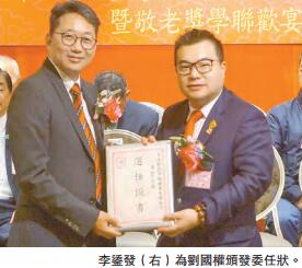 【香港商報网訊】記者張芃芃報道:香港劉氏宗親總會成立62周年會慶暨註冊有限公司第26屆理監事就職典禮,日前假金鐘名都酒樓舉行,劉國權、劉用章分別出任新屆理、監事長。典禮上,該會向13名學業成績優异的宗親子弟頒發獎學金,并向70歲以上宗親耆老派發利是。