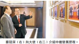蔡會長歡迎肖大使到訪,他介紹香港中總一直與內地關係密切,例如中總從廣交會第一屆開始,一直協助海外商界發展工作直至2000年。目前中總擔任全國人大、政協人數眾多,在立法會也有中總成員代表。這些顯示了中總在各方面均具一定影響力,亦是對中總多年來愛國愛港,積極配合國家及香港發展宗旨的肯定。