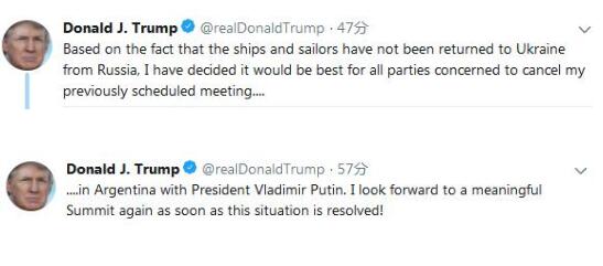 特朗普在推文中表示,鉴于船只和船员尚未从俄罗斯返回乌克兰, 我决定有关各方最好取消我先前安排的(与普京总统的)会议。在随后的另一条推文中,特朗普说, 一旦情况得到解决,我再次期待有意义的首脑会晤。
