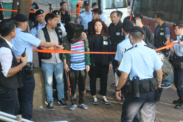 疑犯被黑布蒙頭帶返南山邨重組案情。
