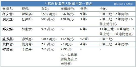 ▲台湾六大都市市长当选人财产申报一览