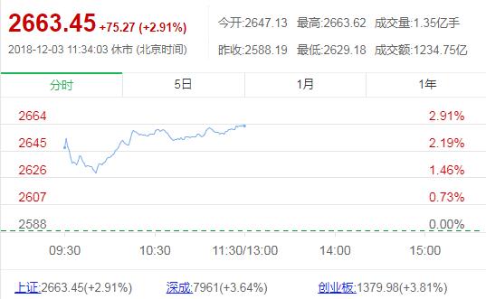 12月3日消息,今日两市集体高开,早盘做多氛围浓厚,三大股指盘初小幅下探后逐渐回升,持续高位震荡,市场成交量显著放大。从盘面上看,两市仅30余只个股下跌,各大板块、概念股集体飘红,边缘计算、期货、白酒、知识产权保护、5G、券商等板块涨幅居前。截止午间收盘,沪指报2663.45点,涨幅2.91%,深成指报7961.00点,涨幅3.64%;创指报1379.98点,涨幅3.81%。