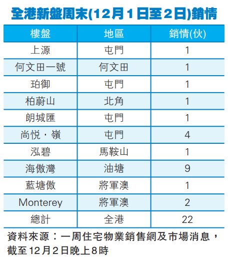 記者鄭珊珊報道:在居屋抽籤結果公布後,有不少買家將回流至私人市場,形成小型樓市小陽春。周末一手樓市錄得22宗成交,4個屯門新盤均錄得成交記錄。成交數量最多的是早前推出優惠吸引向隅客的油塘海傲灣,周末合共錄得9宗交易,大多為招標售出。