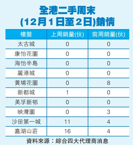 該行指出,他們成交集中於樓價較低的新界區,共有5宗交投。嘉湖山莊則錄得3宗成交,沙田第一城較上周亦多1宗成交,其餘8屋苑均在周末「捧蛋」。該行特別指出,九龍黃埔花園現滑鐵盧,上周末成績交白卷有欠理想。