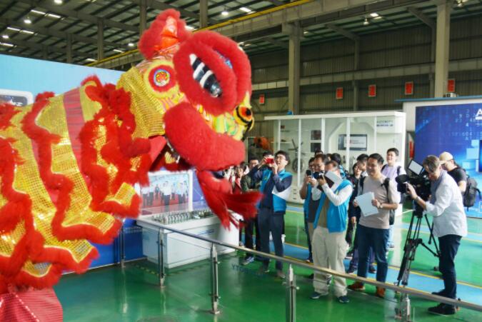 世界主流媒體記者參觀廣東利迅達機器人系統股份有限公司,觀看機器獅表演。