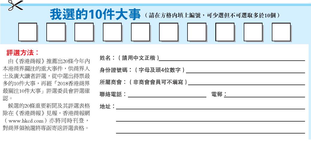 由《香港商報》推薦出20條今年內本港商界關注的重大事件,供商界人士及廣大讀者評選,從中選出得票最多的10件大事,再經「2018香港商界最關注10件大事」評選委員會評選確認。