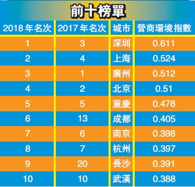 具體來看,深圳從去年的第三名躍升至排行榜首位,上海從去年的第四名上升至第二名。廣州從去年的第一名下滑至第三名,北京從去年的第二位下滑至第四名。重慶仍然穩居第五名。其他進入前10名的城市依次為成都、南京、杭州、長沙、武漢。