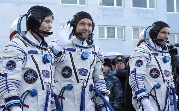 在哈薩克斯坦拜科努爾航天發射場,(從左至右)美國女太空人麥克萊恩、俄國太空人科諾年科和加拿大太空人聖雅克在出發儀式上向人們致意。 新華社