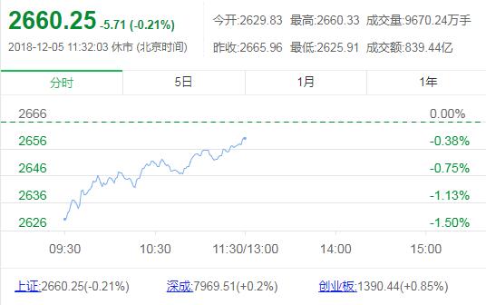 12月5日消息,两市早盘集体低开,在知识产权保护、半导体、有色、白酒等板块的带动下,市场逐渐回暖,两市逐渐回升,创业板指率先翻红,深成指随后也成功翻红,沪指跌幅收窄。从盘面上看,知识产权保护概念股掀涨停潮,受利好消息带动,赛马概念股盘中直线拉升,尾气治理、有色、白酒等板块涨幅居前,园区开发、创投、保险、燃气水务等板块跌幅居前。截止午间收盘,沪指报2660.25点,跌幅0.21%,深成指报7969.51点,涨幅0.20%;创指报1390.44点,涨幅0.85%。