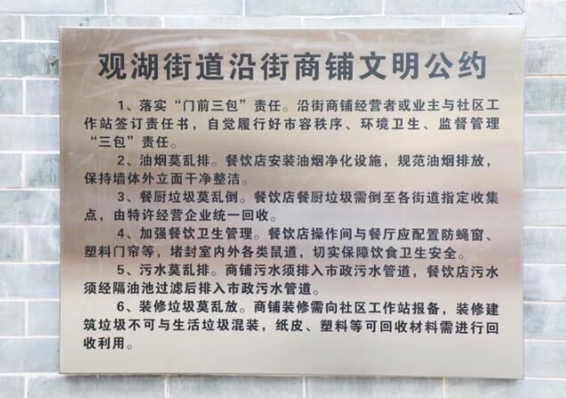 记者在观湖街道两大主要商业街――格澜郡商业街、和睦样板商业特色街看到,这两大商业街的醒目位置均已悬挂了“文明公约”公示牌。公约内容包括门前责任“三包”、卫生管理、污水、油烟排放等方面。公约明确要求经营者要自觉履行好市容秩序、环境卫生、监督管理“三包”责任;商铺污水须排入市政污水管网,餐饮店污水须经隔油池过滤后排入市政污水管道;餐饮垃圾要做好分类,由特许经营企业统一回收。