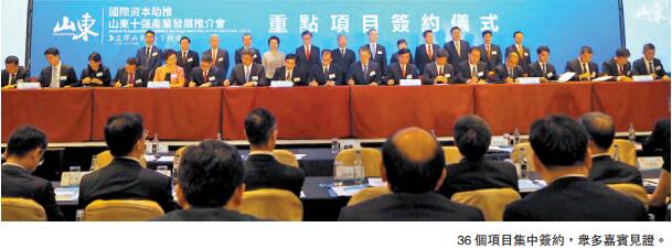 羅康瑞表示,山東工業基礎雄厚,香港可以協助山 東進行產業升級、提高效率,由「山東制造」變成 「山東創造」。貿發局一直致力於與山東建立更緊密 的合作關系,他誠邀山東企業來參加明年1月的亞洲 金融論壇,和明年9月的「一帶一路」高峰論壇,促 進企業在港上市。通過商貿配對的方式,讓魯港企業 攜手走出去,期待兩地合作領域更多更廣。山東省商 務廳廳長佘春明主持重點項目簽約儀式,共有36個 項目集中簽約,項目總投資312.5億美元。