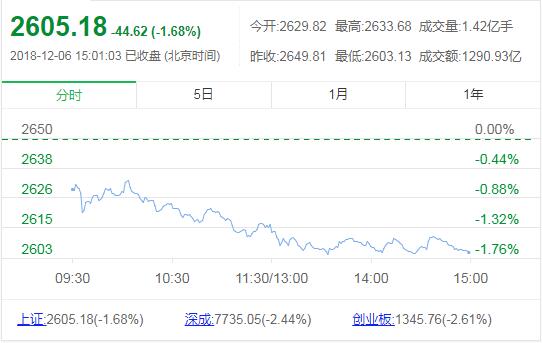12月6日消息,两市早盘集体低开,5G概念股全线走弱,科技股也纷纷回调,三大股指震荡走弱,受网传带量采购谈判结果利空消息刺激,医药股午后开盘集体跳水,股指进一步下行,沪指逼近2600点整数关口。从盘面来看,各大板块题材纷纷飘绿,资金避险情绪升温,黄金股盘中逆市拉升,军工、水利等板块跌幅较窄,高送转、芬太尼、5G、知识产权保护等板块跌幅居前。个股方面,临近收盘,4+7带量采购预中选结果出炉,京新药业(10.000, 0.03, 0.30%)、华海药业(14.930, 0.44, 3.04%)双双直线拉升,后者盘中触涨停,据报道,华海药业此前预先入围时降价充分,下午不再议价,并且华海药业成为中标药品最多的企业。截止收盘,沪指报2605.18点,跌幅1.68%,深成指报7735.05点,跌幅2.44%;创指报1345.76点,跌幅2.61%。