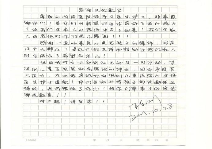 2011年10月28日,患儿家长陈先生委托同济医院向社会发出一封道歉信,向深圳市儿童医院全体医护人员致歉。道歉信称,“当初你们对我孩子的诊断是正确的”。