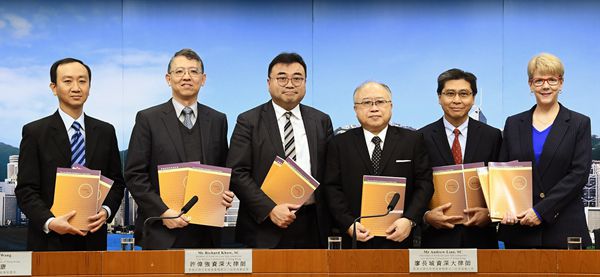 法律改革委員會檔案法小組委員會主席廖長城資深大律師(右三),小組委員會成員陳華疊(右二)、李達詩(右一)和許偉強資深大律師(左三)等出席記者會,發表檔案法諮詢文件。