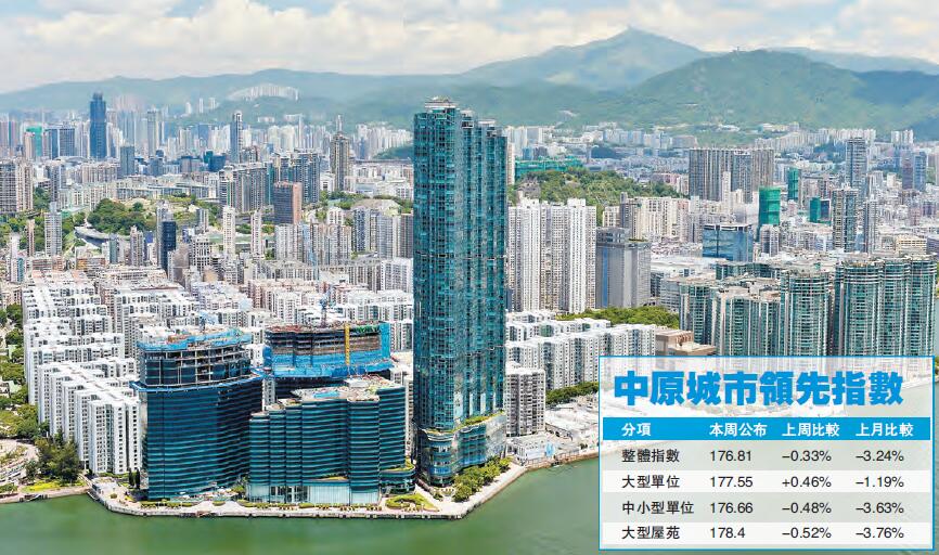 CCL按周跌0.33%,連跌10周共5.25%。中原城市大型屋苑領先指數報178.40點,按周跌0.52%,同樣連跌10周共5.57%。中小型單位指數跌浪最長,報176.66點,按周跌0.48%,連跌14周共6.62%,同時創最長連跌紀錄。