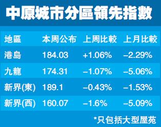 雖然整體樓價向下,但港島及大型豪宅樓價率先單周反彈。港島指數錄184.03點,按周升1.06%,升幅為20周最大。CCL大型單位錄177.55點,升0.46%,升幅為17周最大。