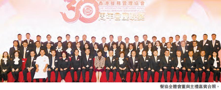 【香港商報网訊】記者餘江強報道:香港餐務管理協會成立30周年會慶晚宴,日前假香港海洋公園萬豪酒店宴會廳舉行,行政長官林鄭月娥瓶政務司司長張建宗瓶中聯辨協調部副部長張強、行政會議成員兼立法會議員張宇人蒞臨主禮,內地、海外及本地的餐飲業商會首長、工會領袖、機構負責人,逾800位嘉賓出席,同申慶賀,場麵熱鬧。