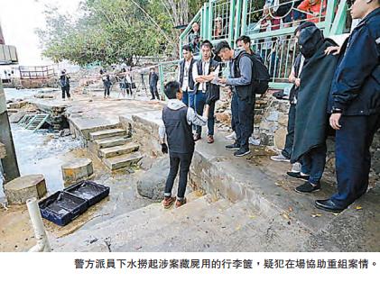 昨午2時許,大批重案組探員抵達發現死者的現場一帶調查,部分探員在岸邊搜索,飛虎隊「水鬼隊」人員奉召乘坐小艇出海打撈涉案證物,稍後疑犯被押至華貴對開岸邊協助調查,3名蛙人根據疑犯所指方向落水,終在距離岸邊5至10米撈起一個藍色行李篋,篋上附有牛皮膠紙,相信是用作藏屍。警方將行李篋檢走,疑犯逗留約半小時後離開。