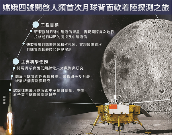 【香港商報网訊】昨天凌晨2時23分,中國在西昌衛星發射中心用長征三號乙運載火箭成功發射嫦娥四號探測器,開啟了月球探測的新旅程。預計飛行27天後,嫦娥四號將於2019年初在月球着陸,這將是世界第一顆在月球背面着陸和巡視探測的太空載具。