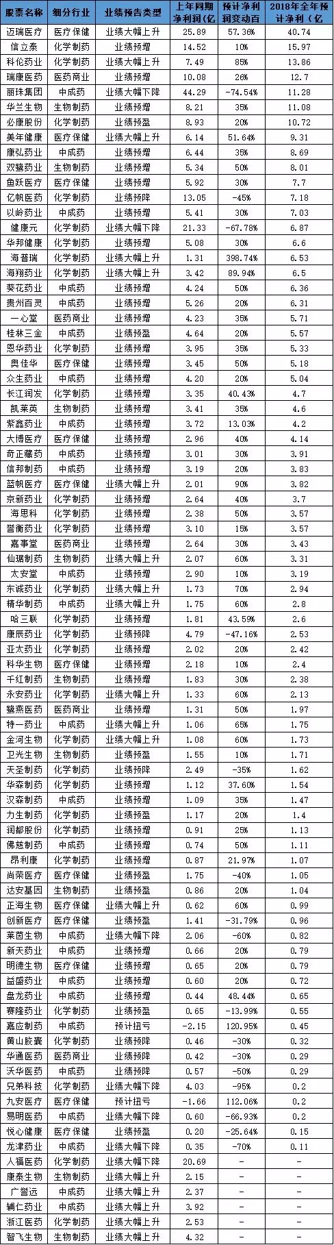 需要注意的一个现象是在盈利的企业中,除生物制药细分行业外,其余细分行业预告盈利的企业中预减企业占比也较高。化学制药、医疗保健、医药商业和中成药预减合计占细分行业的比例分别为25.81%、18.75%、16.67%和19.23%。