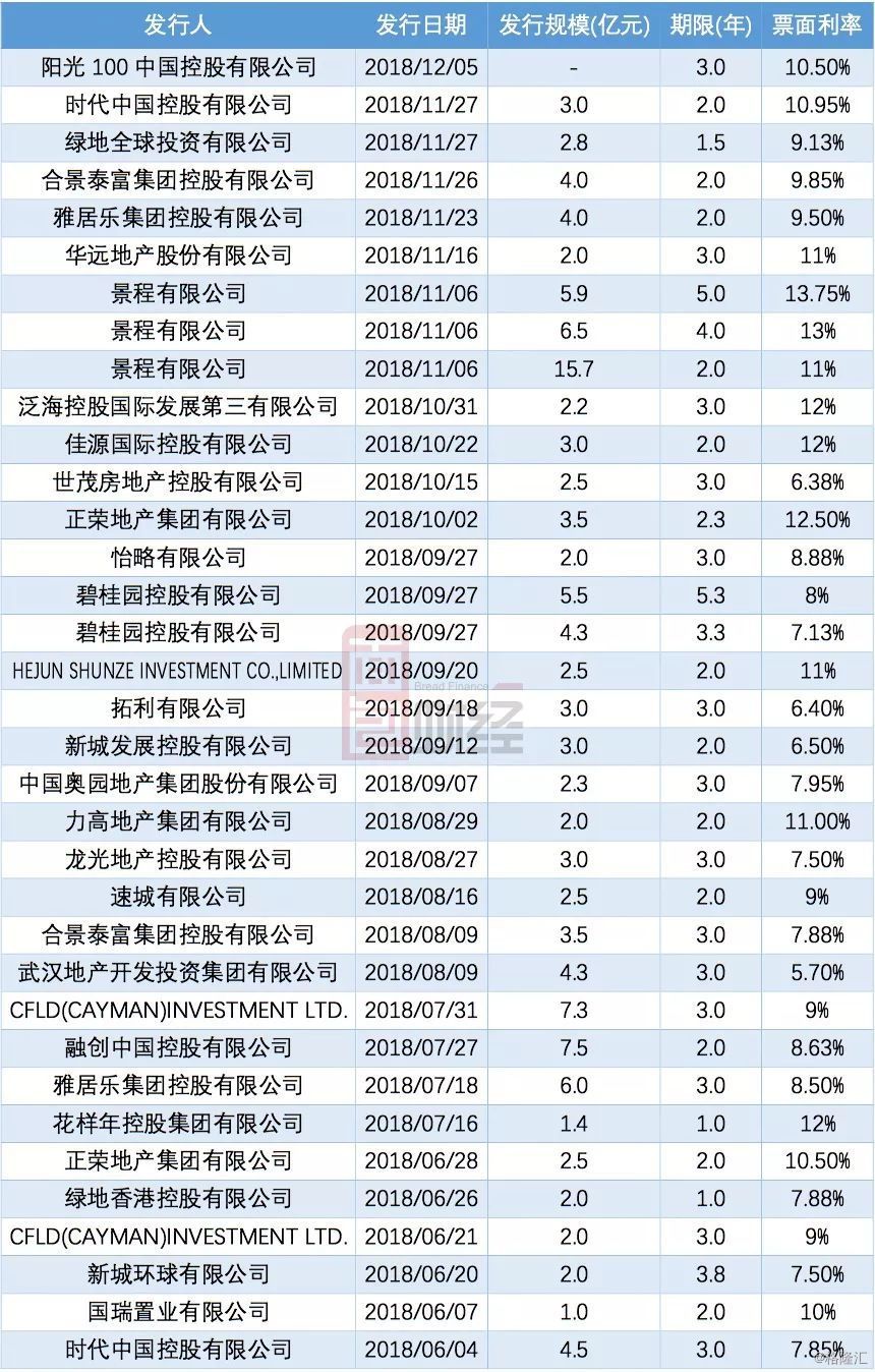 从以上数据来看,6月至今房企的发债利率半数以上都在10%左右,而如此高利率的债券,期限并不长,其中时代中国发行的3亿美元债期限仅两年,票面利率已高达10.95%。