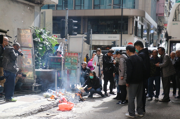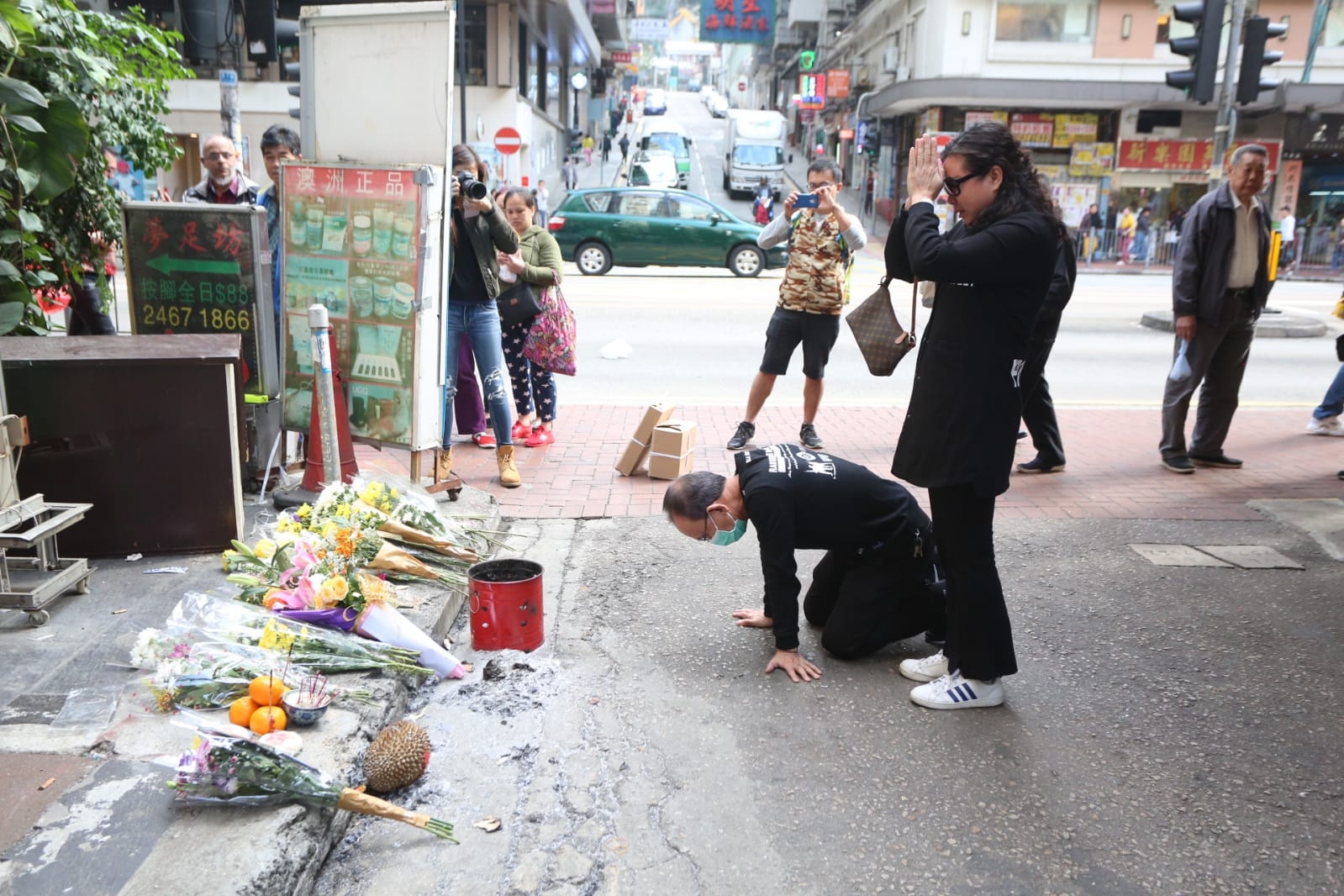 而另一對姓陳夫婦,是陳婦生前好友,帶着鮮花並在包裝紙上貼着陳婦照片,並寫上「姐姐,早登極樂,細佬敬輓」字樣,陳先生更情緒激動,跪在地上鞠躬致祭。