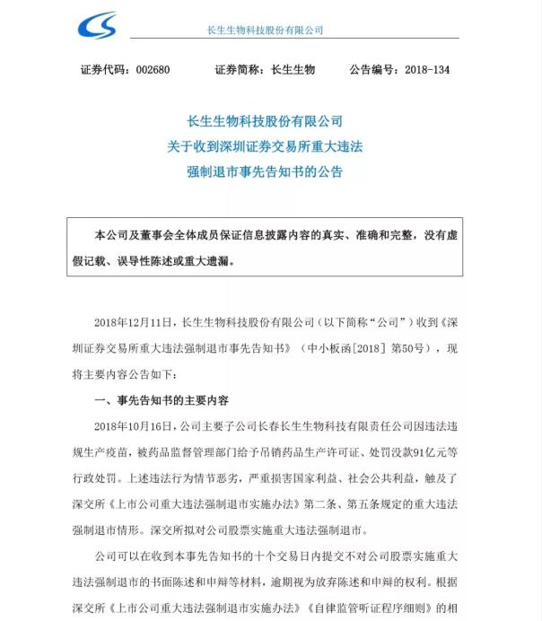 11日下午收盘后,*ST长生发出公告称,收到深圳证券交易所重大违法强制退市事先告知书与中国证监会《行政处罚决定书》及相关人员收到《市场禁入决定书》,深交所拟对其股票实施重大违法强制退市。这也意味着,从问题疫苗事件开始,话题争议持续不减的长春长生,这次恐怕是真的要暂时告别二级市场了。