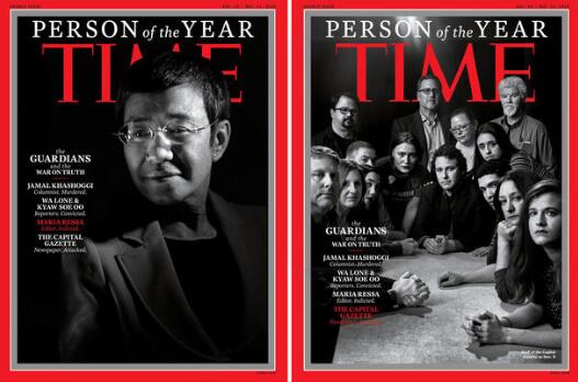 除沙特记者卡舒吉外,登上封面的其它记者和报社如下:被囚禁的路透社记者瓦龙(Wa Lone)和觉梭(Kyaw Soe Oo);菲律宾记者玛利亚·雷萨,现任拉普勒(Rappler)在线新闻网站的首席执行官;以及马里兰州首都报(The Capital)。今年早前,在首都报的办公室发生大规模枪击事件,枪手贾罗德·拉莫斯用霰弹枪击毙了五名雇员。