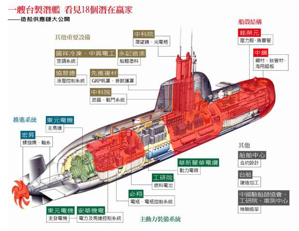 台湾“潜舰国造”宣传图,红色部分为无自研能力,需要进口的设备。