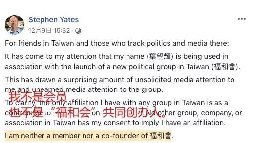 12月10日,一个自称“福尔摩沙共和会(以下简称‘福和会’)”的“台独”团体在台北举办记者会,宣布成立,然而,该组织在前期大肆宣传的所谓“共同创办人”美国政界人士叶望辉(Stephen Yates),并没有出席记者会,甚至还高调发声,将自己择了出去……