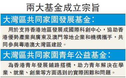 據介紹,「大灣區共同家園發展基金」由駐港大型中資企業、香港企業、內地大型企業及新經濟企業聯合發起,旨在支持香港發展國際創科中心,促進「再工業化」,協助香港優勢產業於大灣區發展。發展基金亦聯合各界青年領袖,發起成立「大灣區共同家園青年公益基金」,為香港青年發展鋪路搭橋,助力青年解決在學業、就業、創業等方面遇到的實際困難和問題。