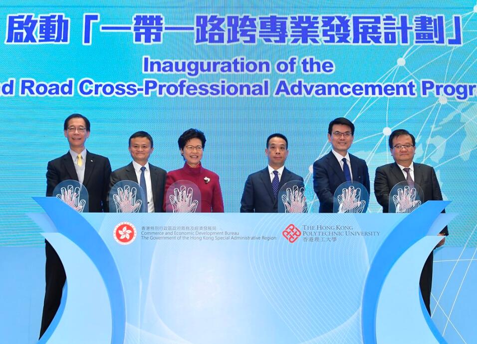 昨日,「一帶一路:由香港 進」論壇暨啟動「『一帶一路』跨專業發展計劃」於政府總部舉行。行政長官林鄭月娥、國務院港澳辦副主任黃柳權、阿里巴巴集團董事局主席馬雲、商務及經濟發展局局長邱騰華等出席並致辭。