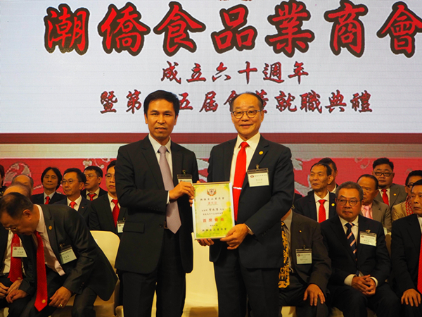 【香港商報网訊】記者郭天琪報道﹕潮僑食品業商會成立六十周年暨第十五屆會董就職典禮日前舉行,曾永浩、方永昌分別榮膺首席會長和常務會長,中聯辦九龍工作部部長郭亨斌、全國政協文史及學習委員會副主任王國強、行政會議成員兼立法會議員張宇人、香港潮屬社團總會主席陳幼南等蒞臨主禮。