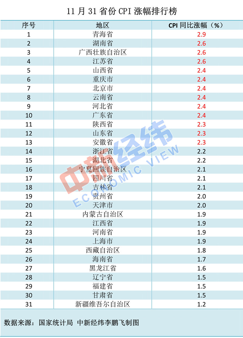 其中,青海11月份CPI同比涨幅领涨全国,已连续两个月居首。11月份CPI同比涨幅排名最后一位为新疆,仅为1.2%,连续3个月最低。