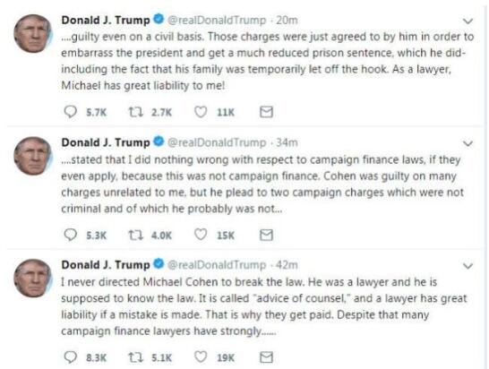 特朗普在推文中说,即便科亨真的做了什么,很多竞选资金财务方面的律师依然力主特朗普本人在竞选资金方面没有犯错。他说,科亨的许多罪名都和自己无关;科亨承认的与竞选相关的两项罪名并不是犯罪,“即便从民事角度看也很可能是无罪的。”他指责科亨承认这两项罪名只是为了让总统难堪、换取减刑,并让自己的家人置身事外。“作为一名律师,迈克尔欠我很多!”
