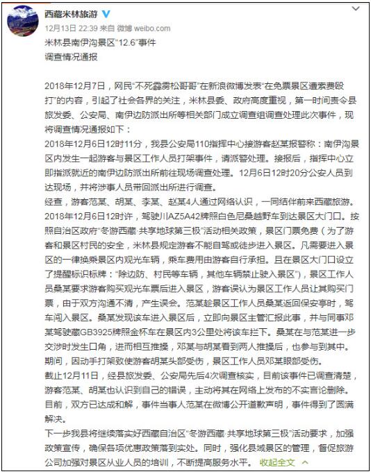 据@西藏米林旅游 12月13日消息,2018年12月7日,网民“不死霹雳松哥哥”在新浪微博发表“在免票景区遭索费殴打”的内容,引起了社会各界的关注,米林县委、政府高度重视,第一时间责令县旅发委、公安局、南伊边防派出所等相关部门成立调查组调查处理此次事件,现将调查情况通报如下:
